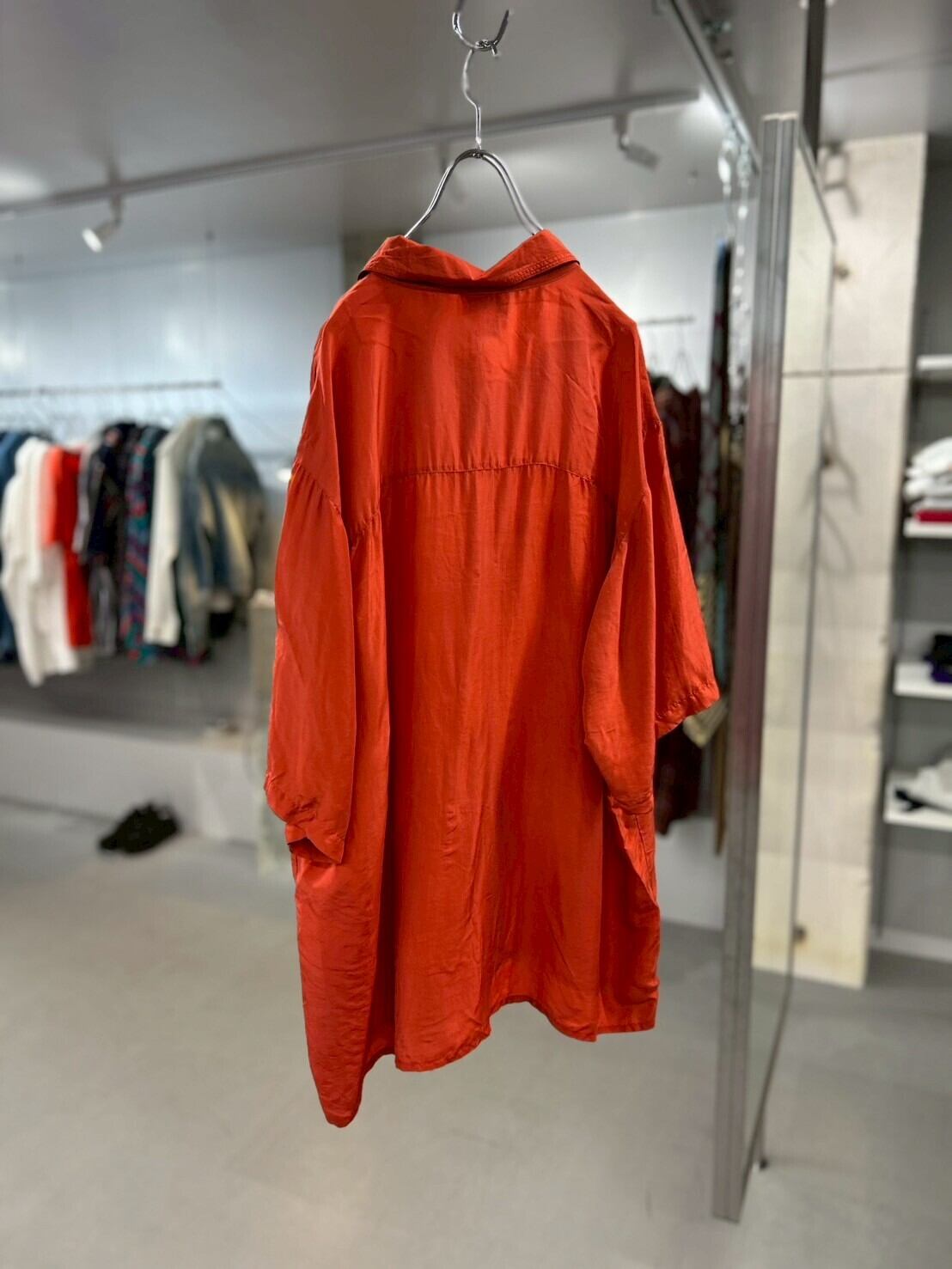 光沢のある朱色シャツは、どこかクラシカルでどこか未来的。
