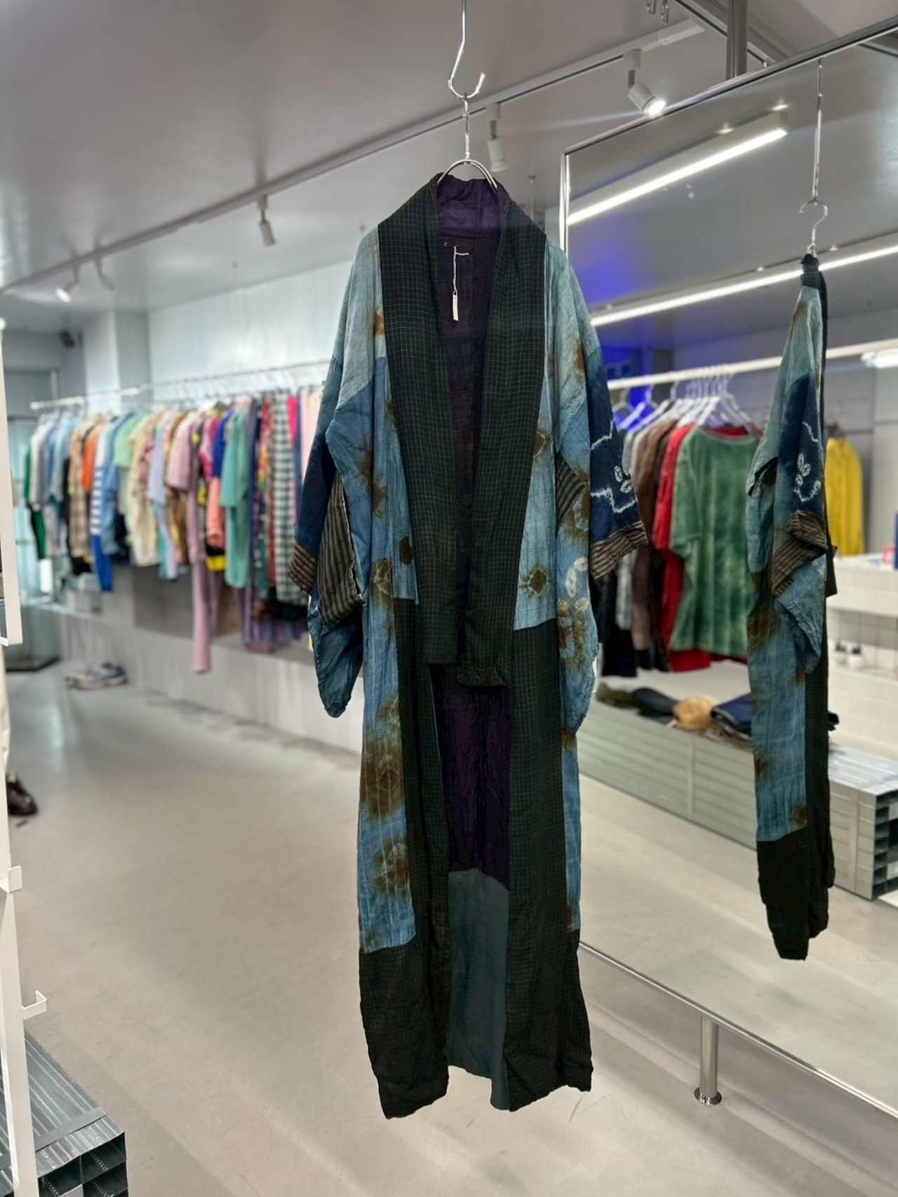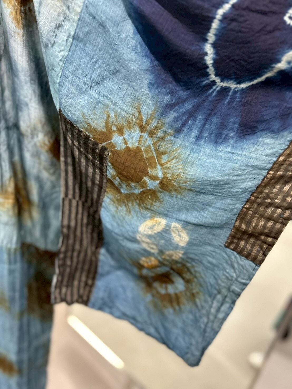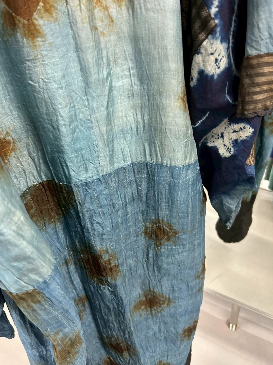 藍染・絞り・縞・格子など、異なる古布をパッチワーク状に組み上げた一点物のアートガウン。