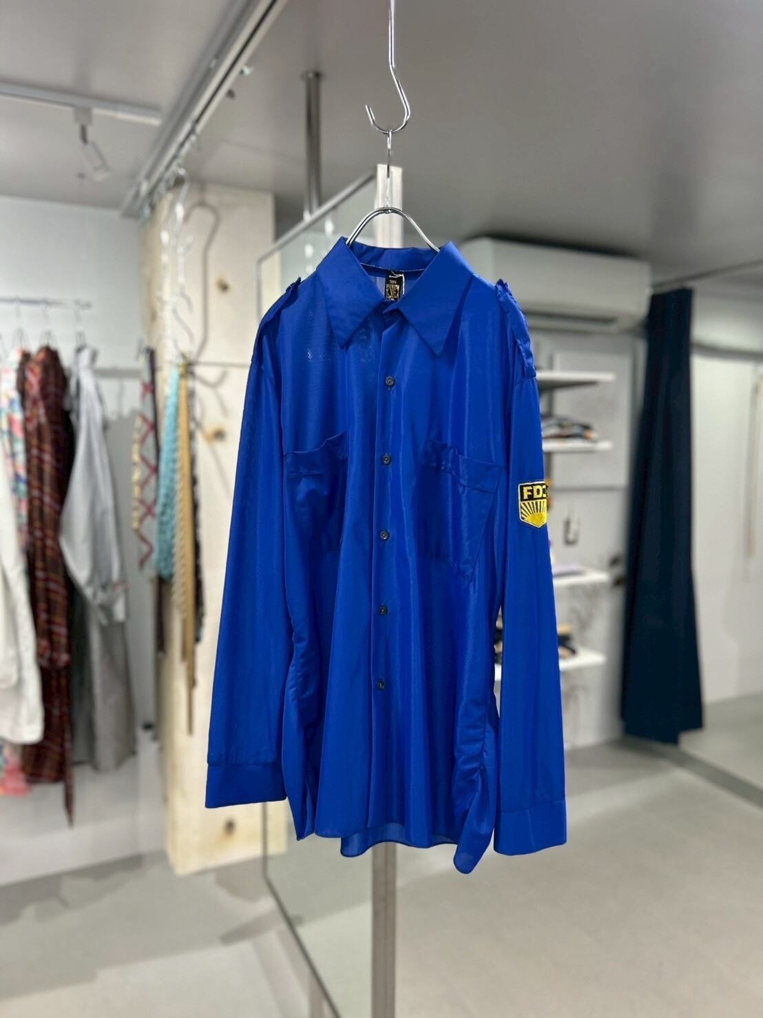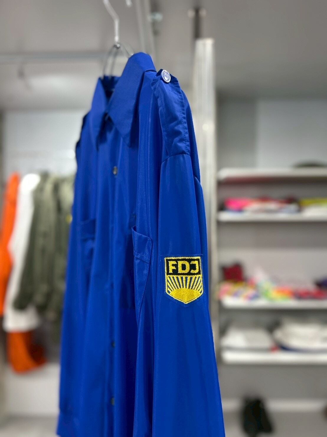 鮮やかなブルーカラーが目を引く、FDJワークユニフォームシャツ。