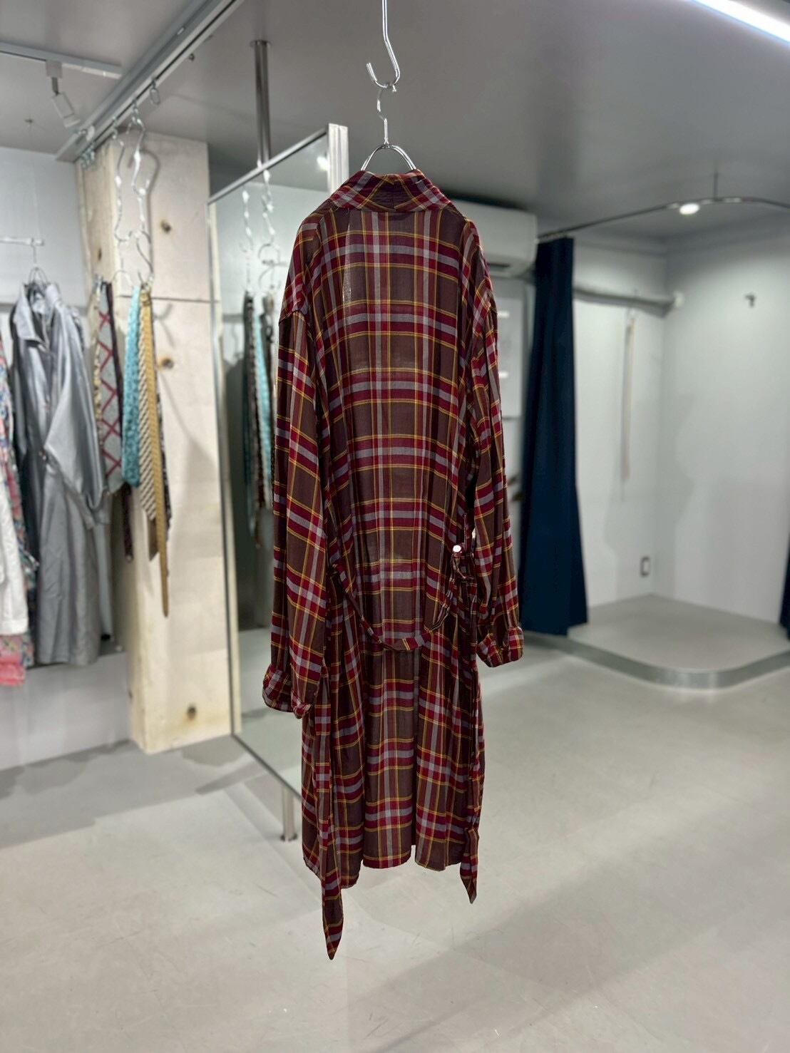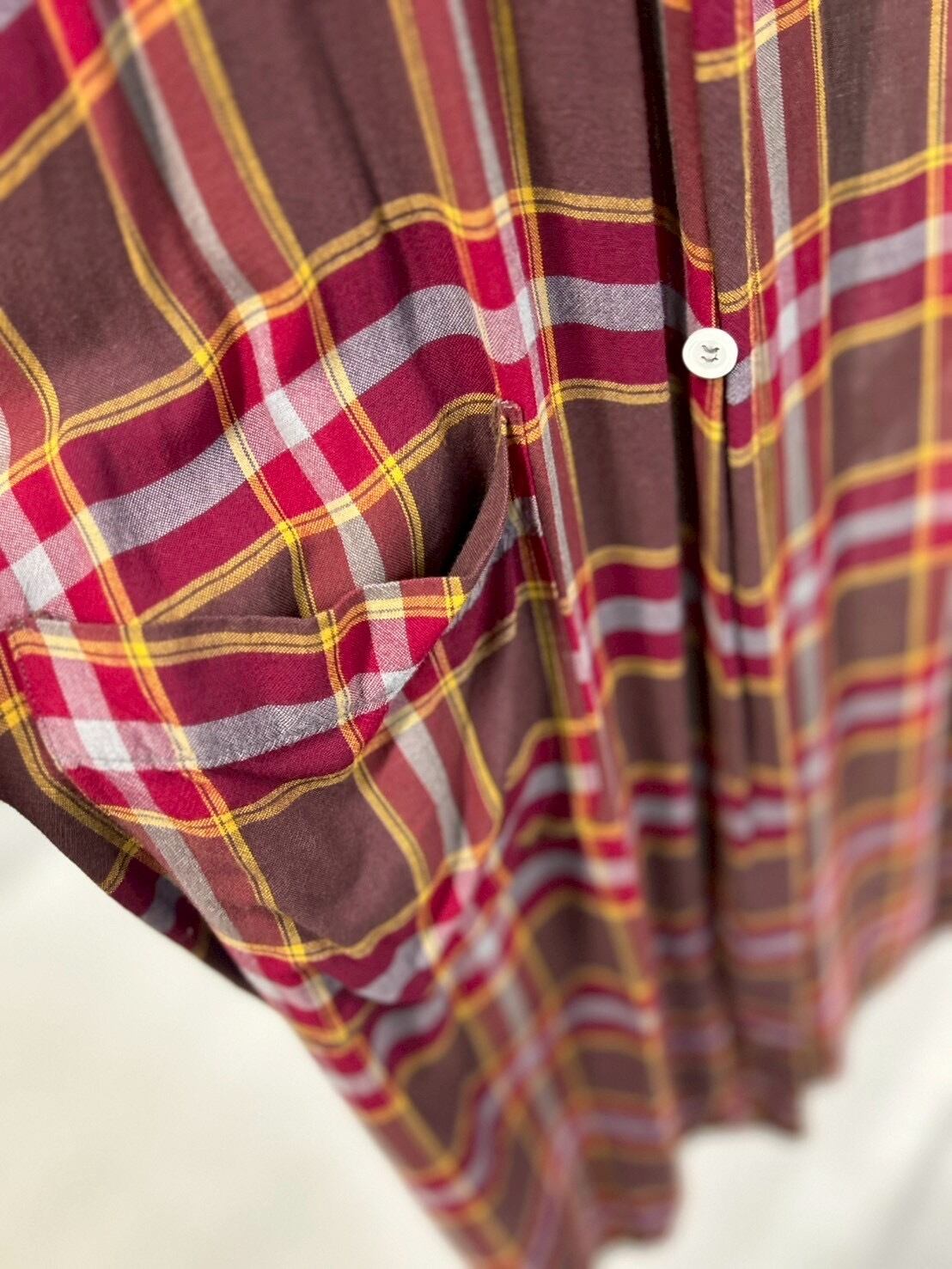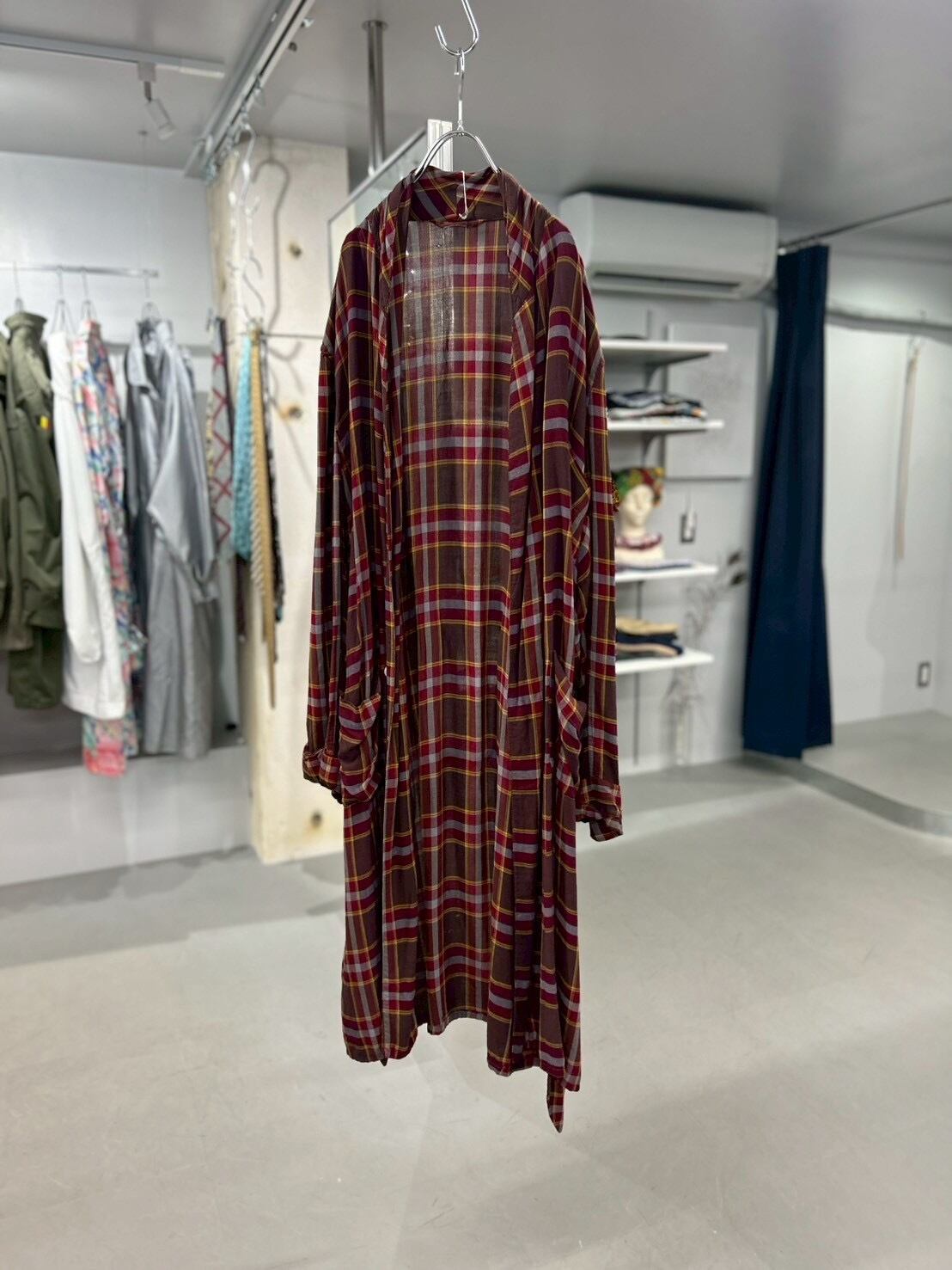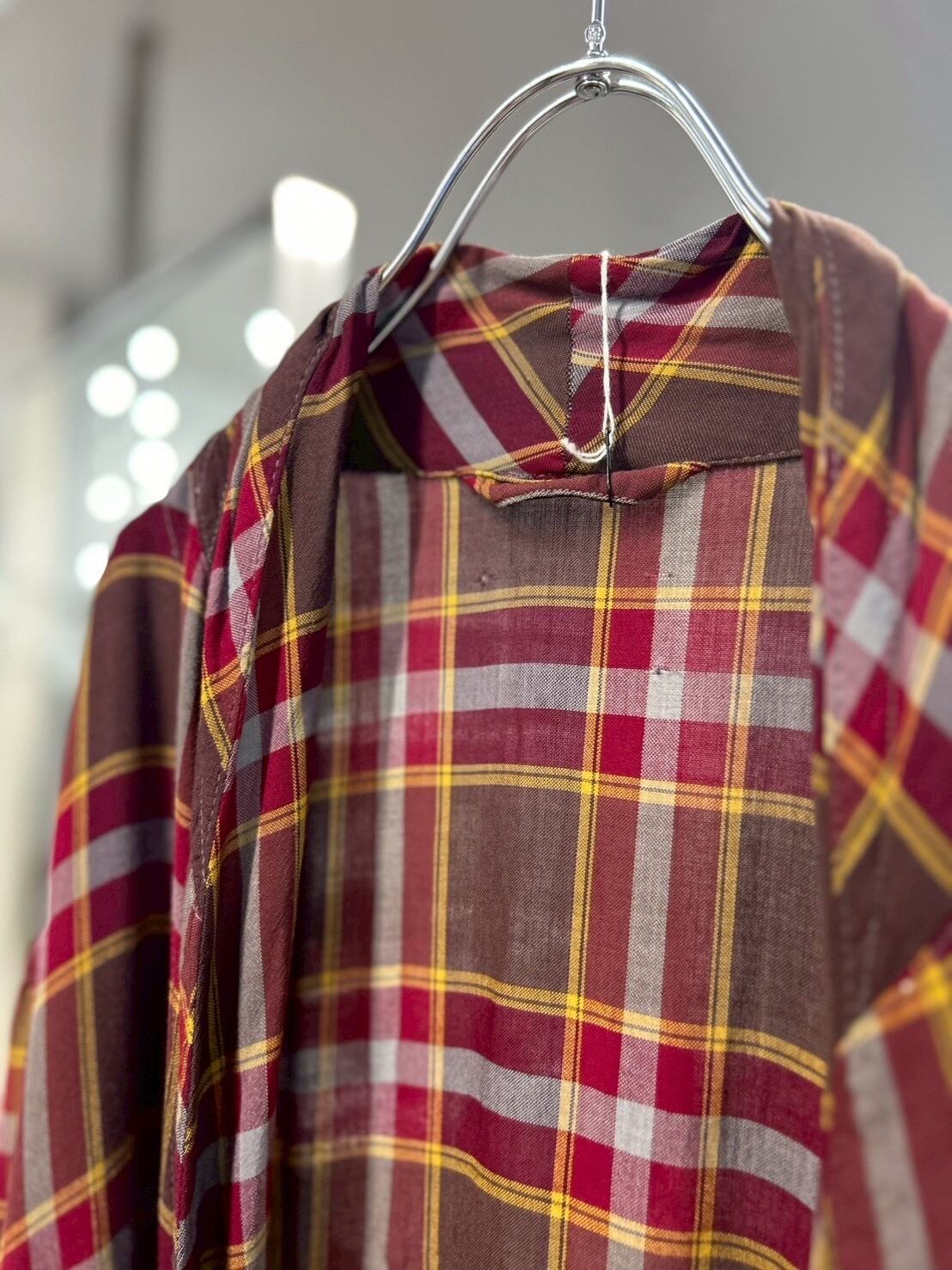 レッド×ブラウンを基調とした落ち着きあるトーンで、薄手の軽やかな生地感が魅力です。