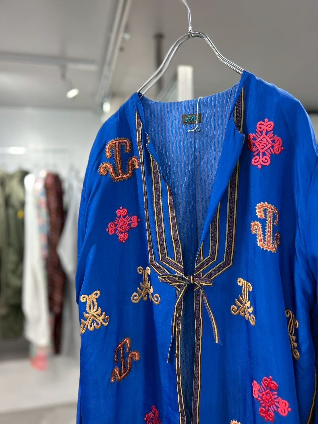 鮮やかなロイヤルブルーに、レッドやゴールドの刺繍が映えるエスニックテイストのガウンジャケット。