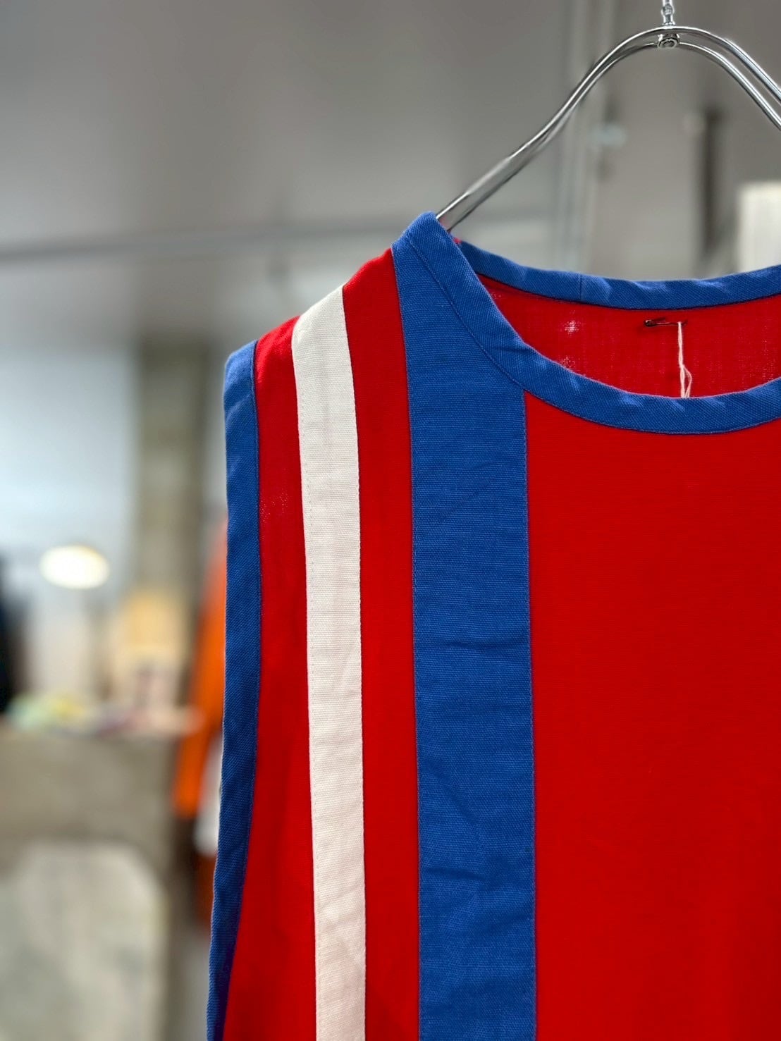 鮮烈なレッドにブルーとホワイトのラインが映える、スポーティーなノースリーブトップ。