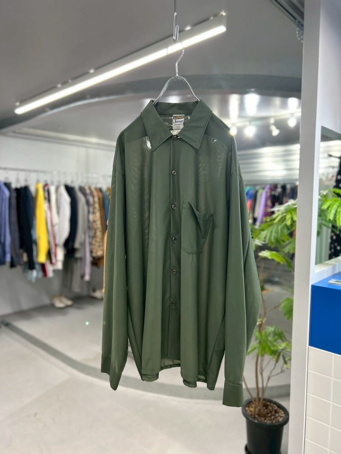程よい透け感が色気を演出する、ダークグリーンのシースルーポリシャツ。