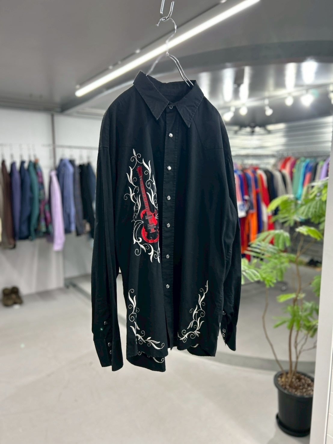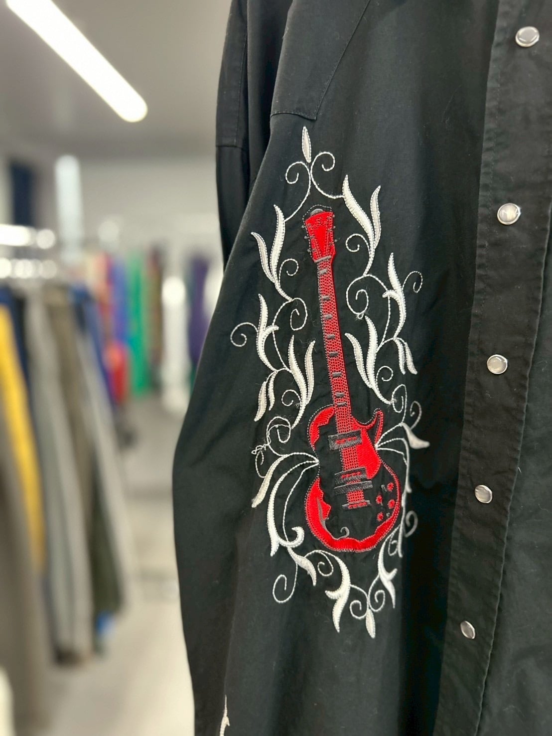 ブラックボディに映えるレッドのエレキギター刺繍と、ホワイトのスワールパターンが存在感抜群。