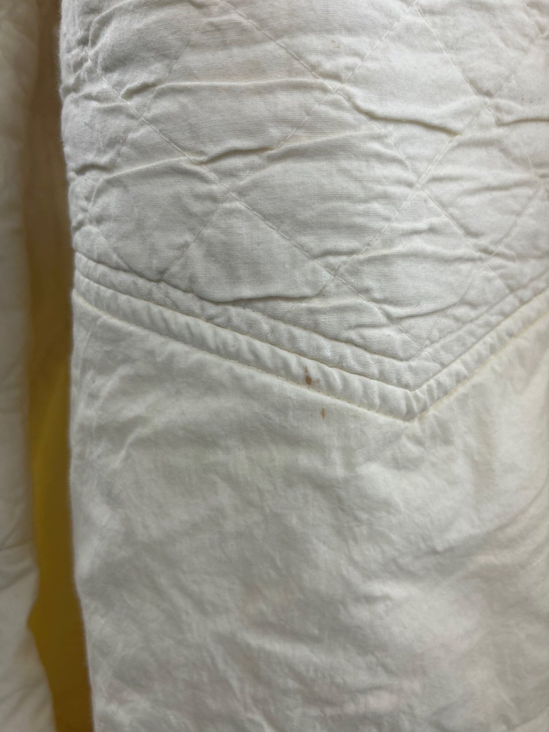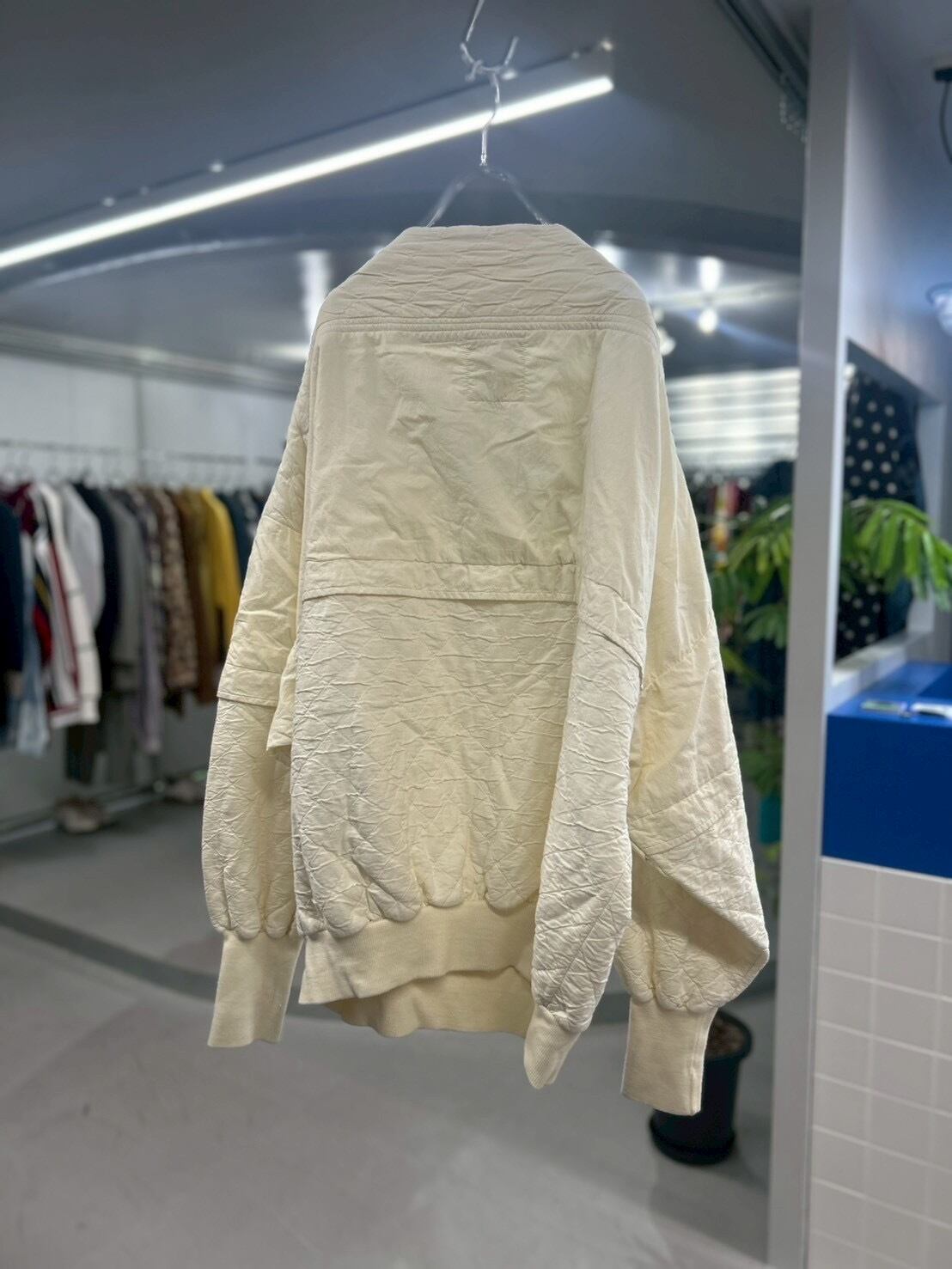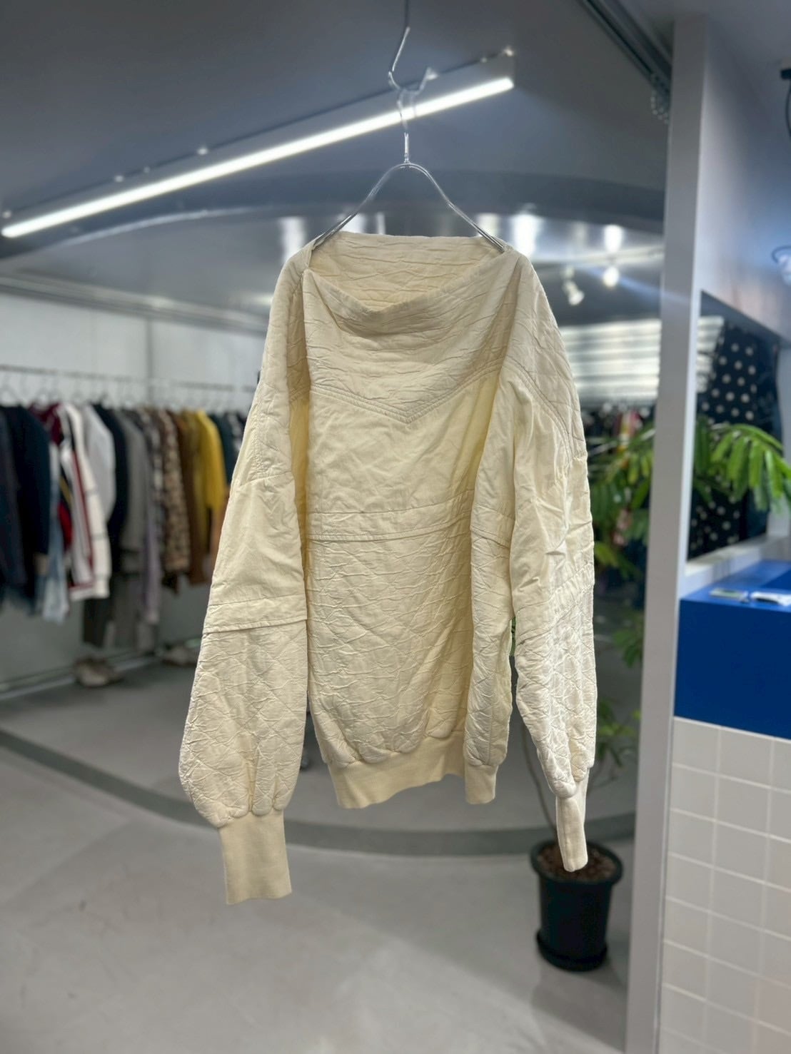フランス発 J. TAVERNITI のキルティングスウェット。クラフト感あるシワ加工と立体感のあるキルティングが特徴の一着。ゆったりとしたシルエットで雰囲気抜群。淡いアイボリーが古着コーデに馴染みます。