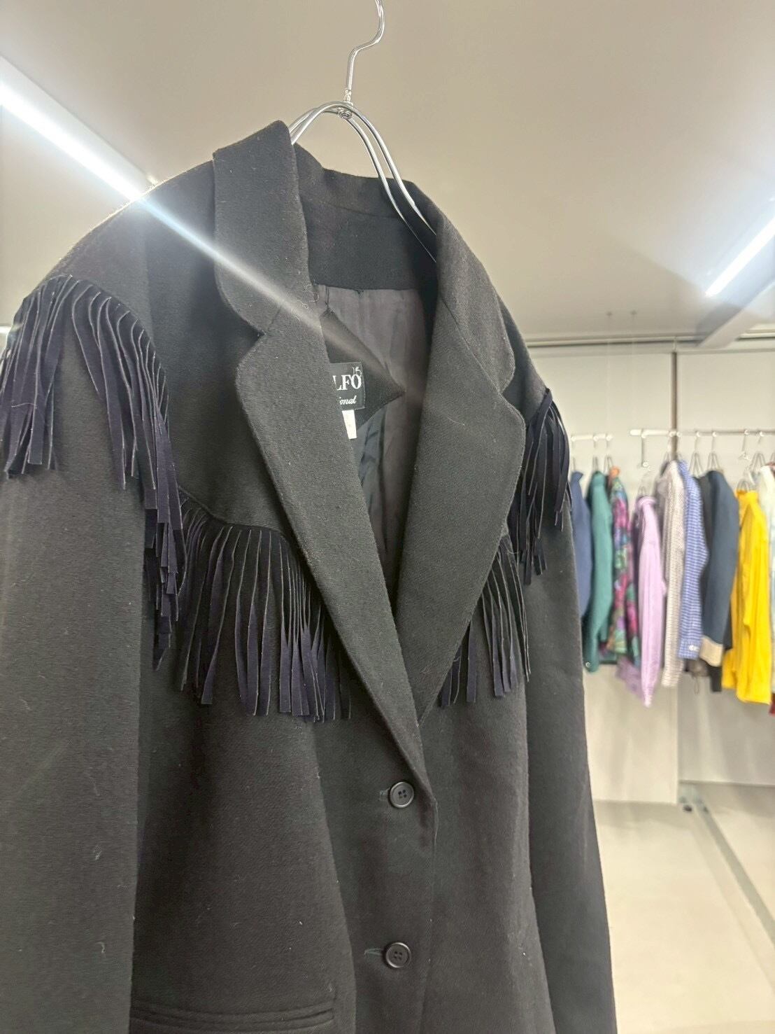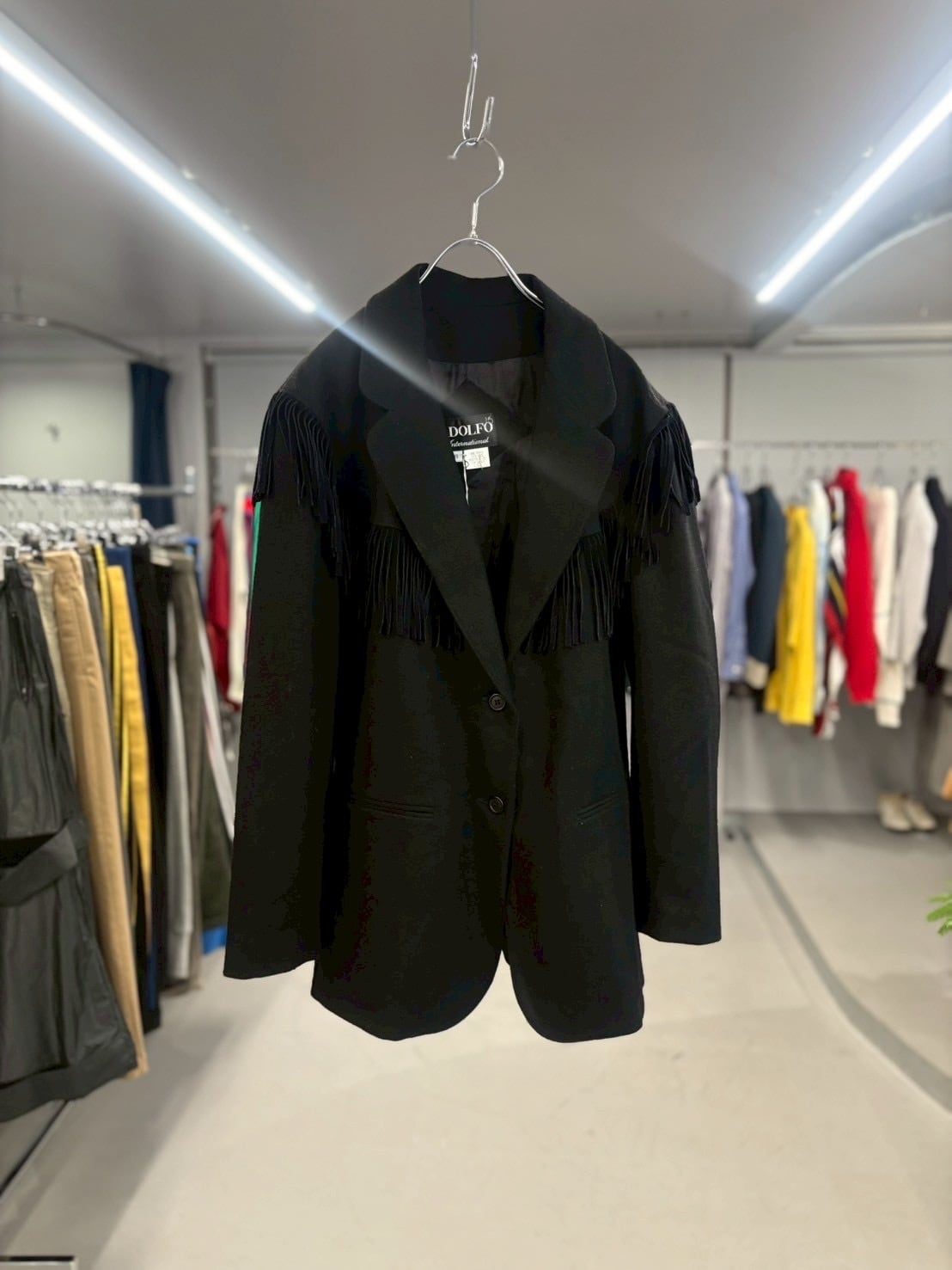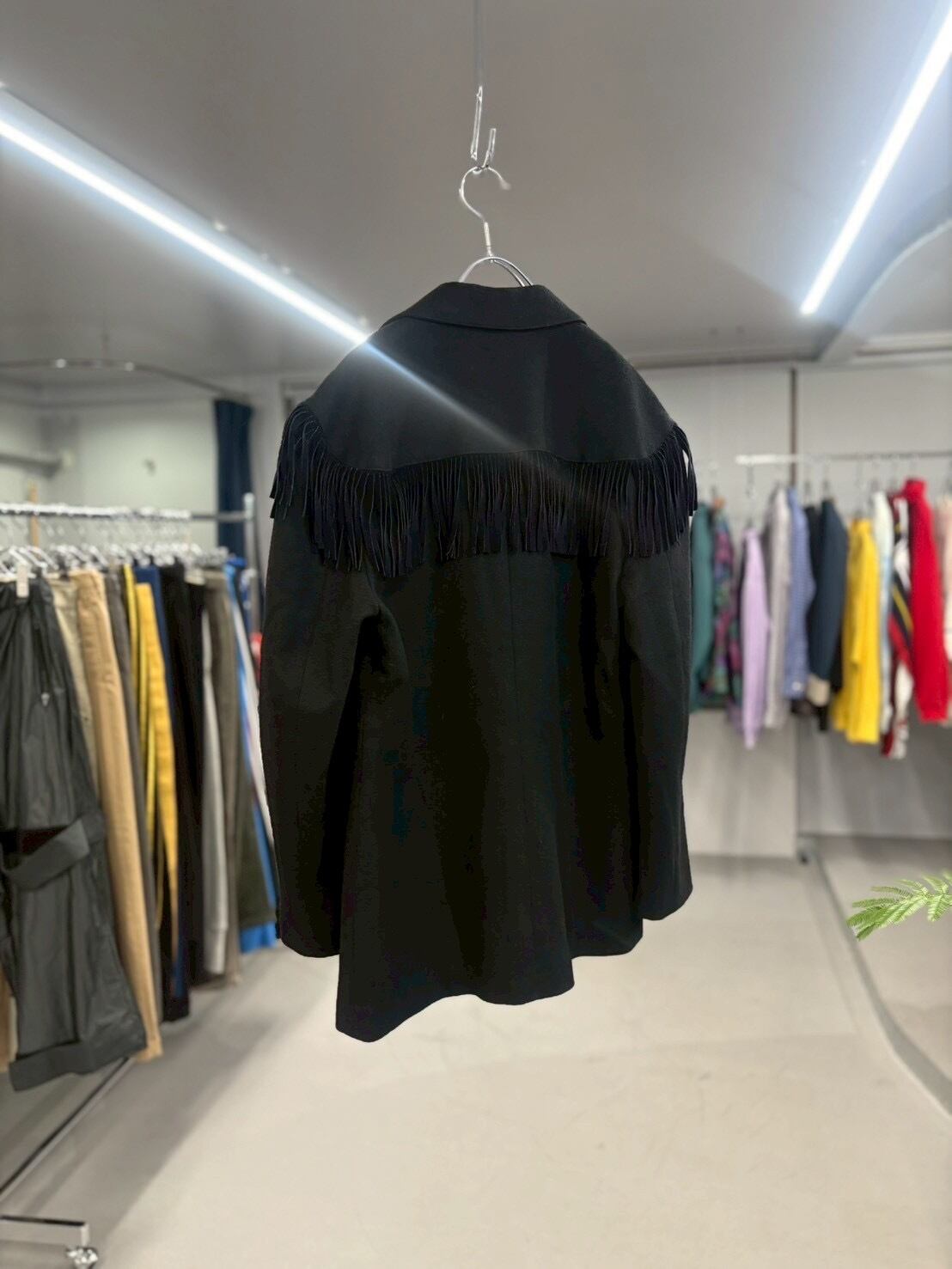 クラシカルなテーラードジャケットにウエスタン要素を落とし込んだ一着。肩から背中にかけて施されたフリンジが、動くたびに揺れ、モードとカントリーを融合させた雰囲気を演出します。モノトーンコーデのアクセントや、ドレスダウンスタイルにも活躍。