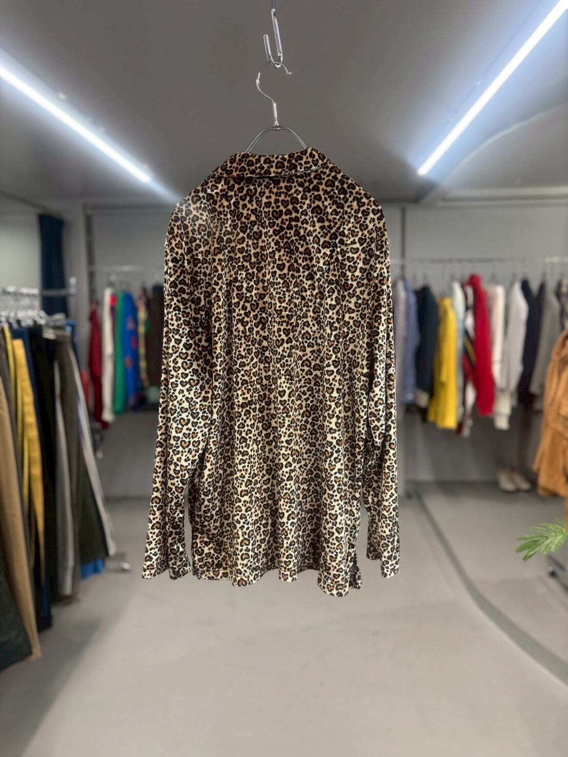 レオパード柄の中にハート模様が隠れた遊び心ある一枚。90s〜00sらしい艶やかなポリエステル素材で、アウターのインナーにも映えるアクセントアイテム。柄シャツで秋冬のスタイリングに差をつけたい方に。