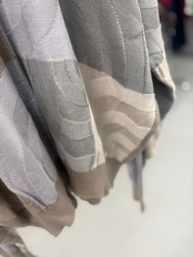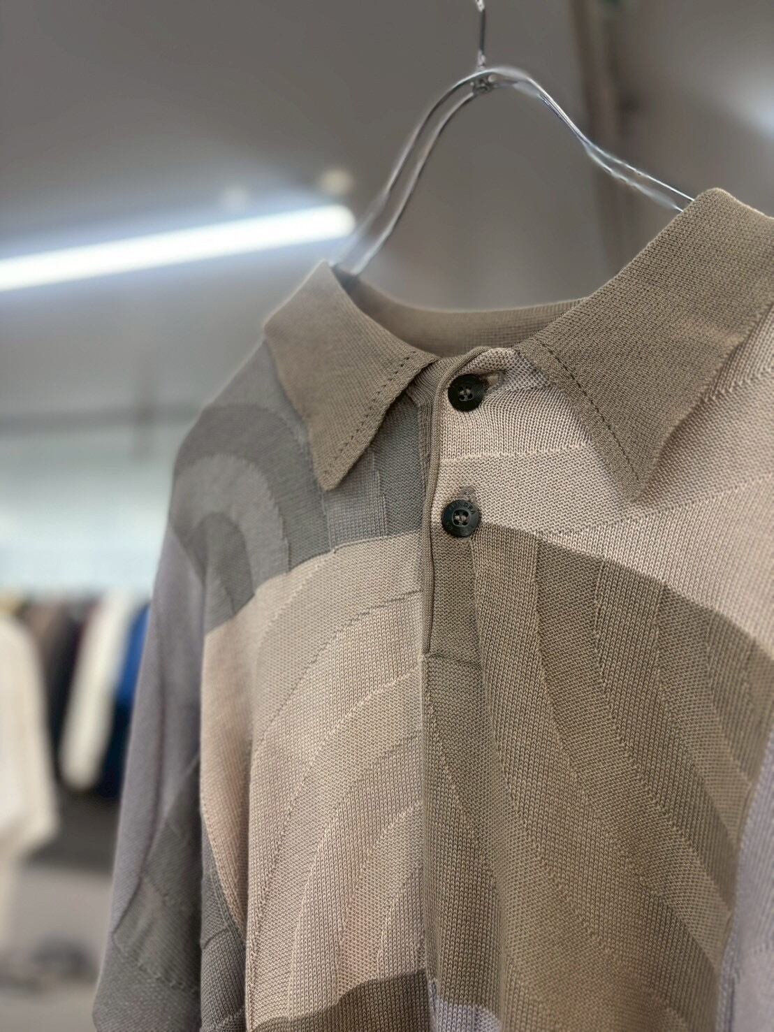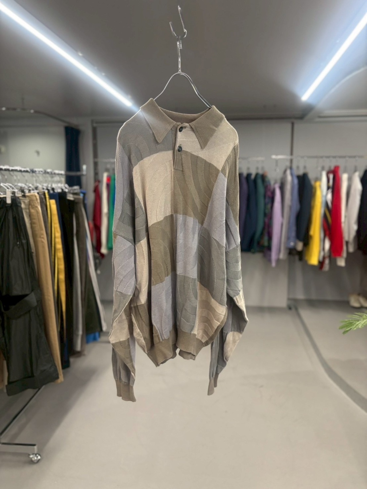 グレーベースにアブストラクトな幾何学模様が広がるデザイン。ポロ襟付きのニットは、古着ならではのリラックス感とトレンド性を兼ね備えた一枚。1枚で主役になる存在感です。