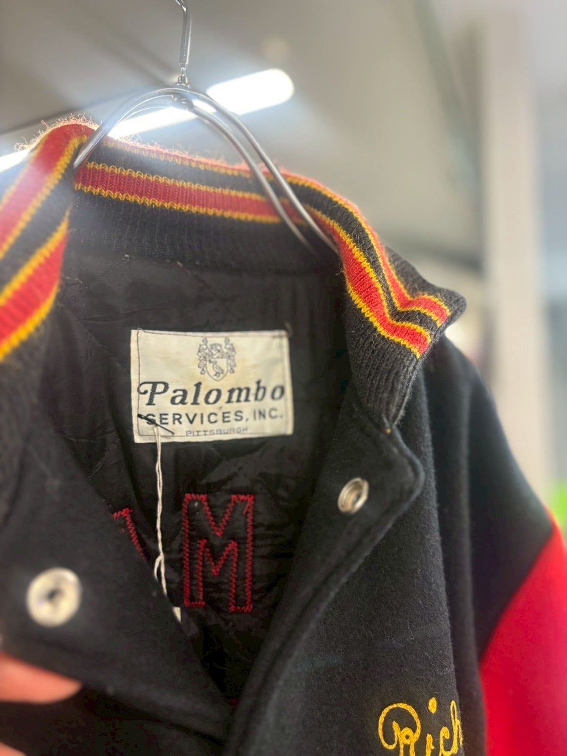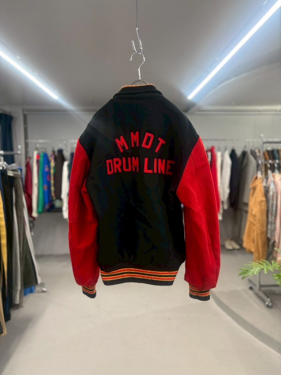 ブラックボディにレッドスリーブの王道配色。胸には「Richard」刺繍、背面には”DRUM LINE”ロゴ入りの一着。ヴィンテージ特有の雰囲気とチーム物らしい存在感で、ストリートにも映えるスタジャンです。