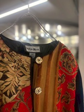 ジャガード織りやベルベット調の切替が目を惹くアートピース。クラフト感のあるボタンや配色デザインは90年代デザインヴィンテージならでは。個性派コーデの主役に。