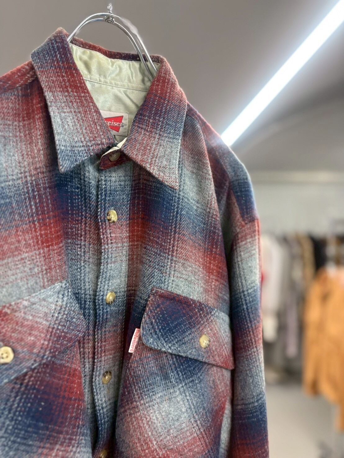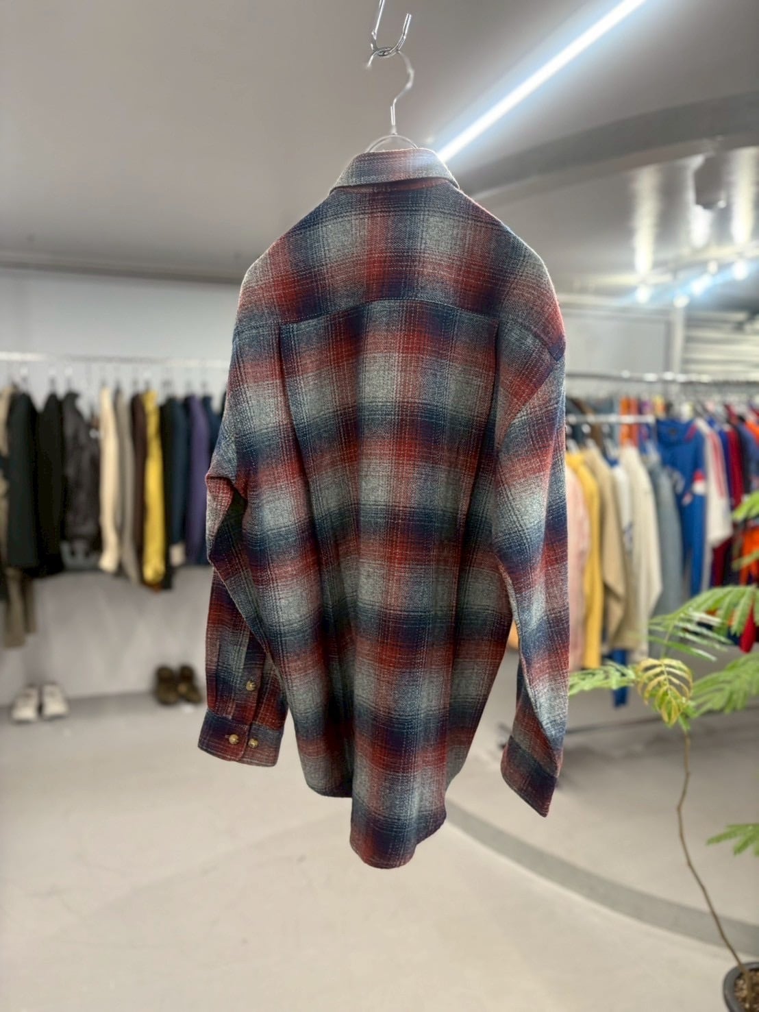 赤×青のグラデーションチェックが存在感を放つ一枚で、胸ポケットにはブランドタグが付属。王道ワークシャツのディテールを踏襲しながらも、裏地付きで暖かさと着心地を兼ね備えています。