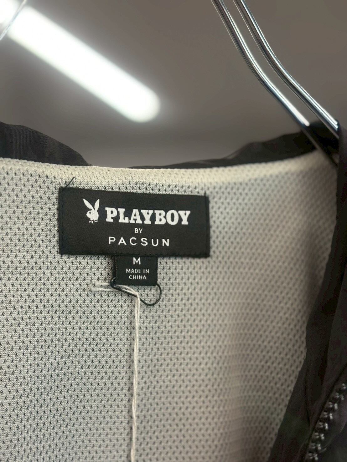 袖にはブルーの“PLAYBOY”ロゴテープ、背面には光沢のある立体ラバーロゴが配置され、