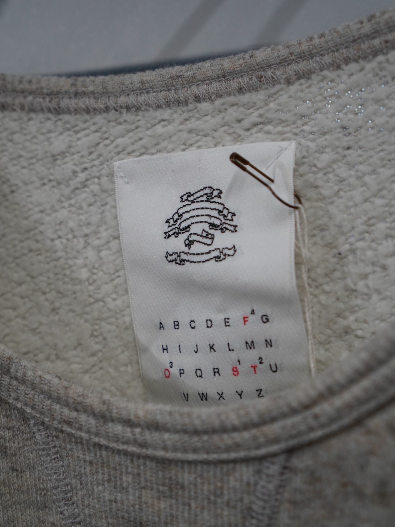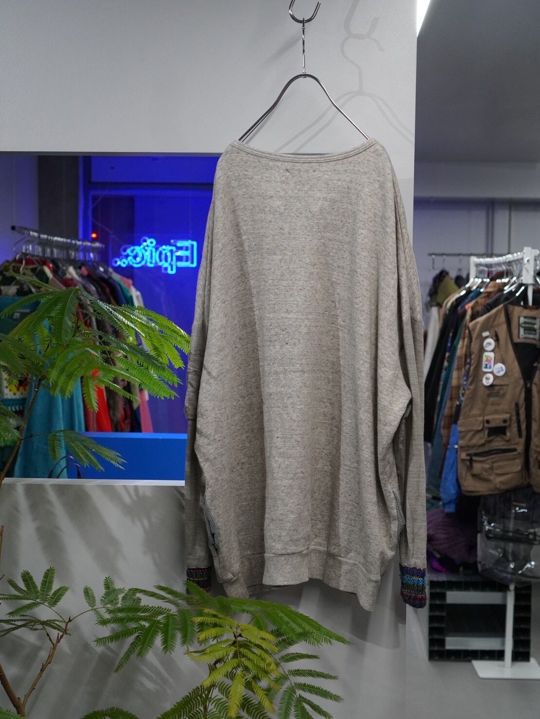 杢グレーに民族パッチをのせたユニークなスウェット。