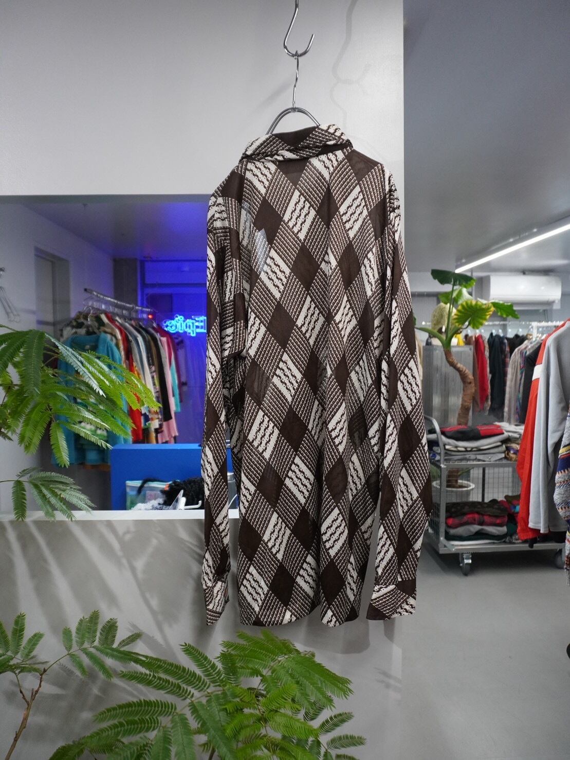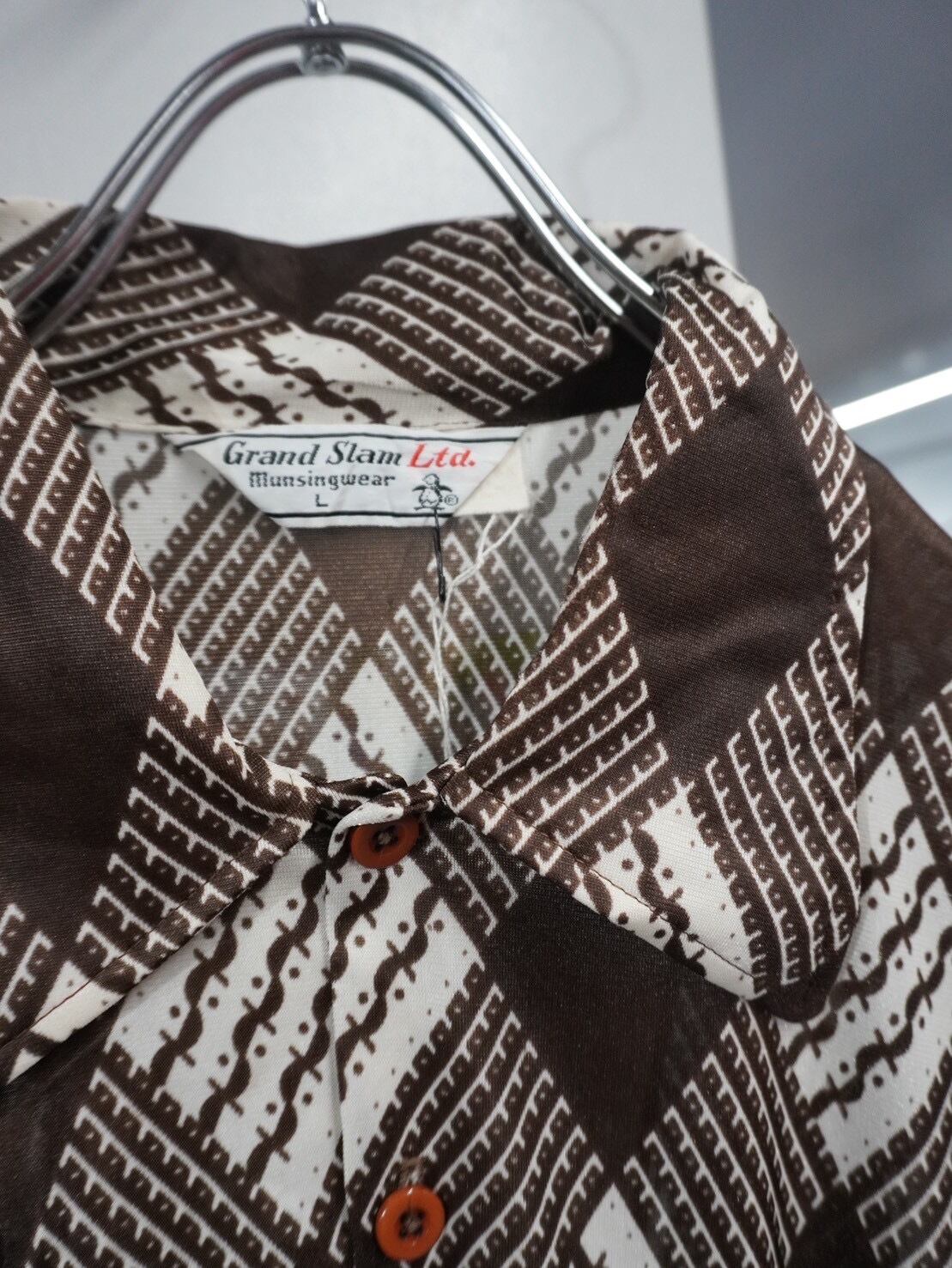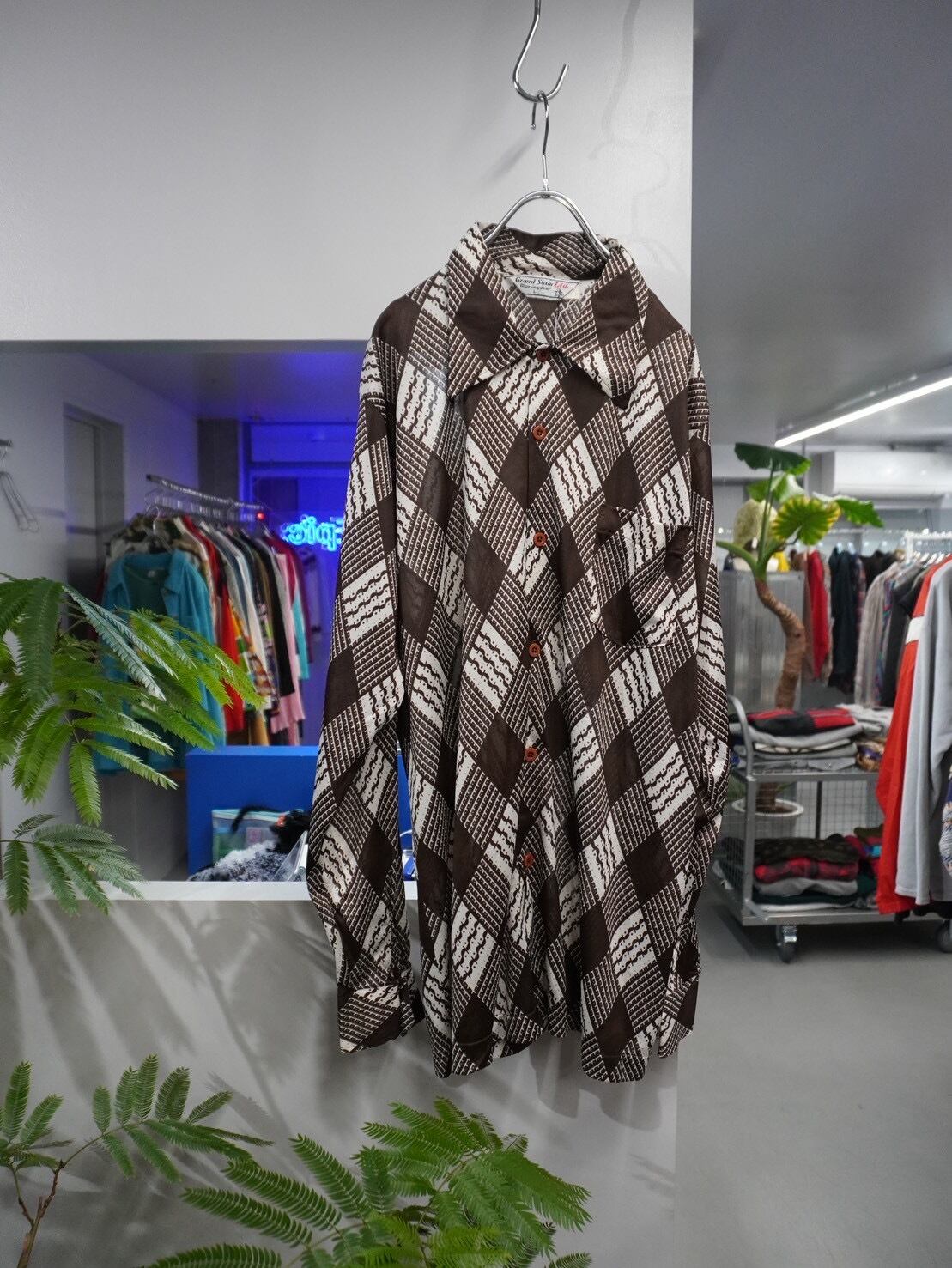 ブラウン×アイボリー配色の幾何学パターンが印象的な、Grand Slam Ltd.のロングスリーブシャツ。