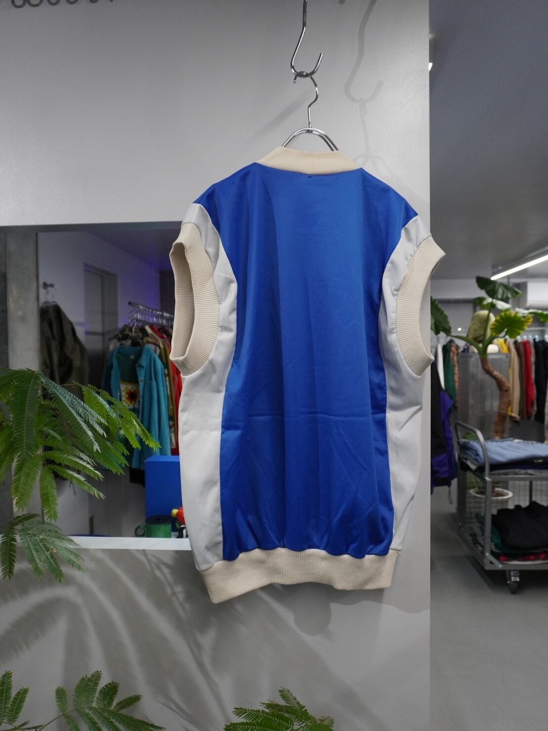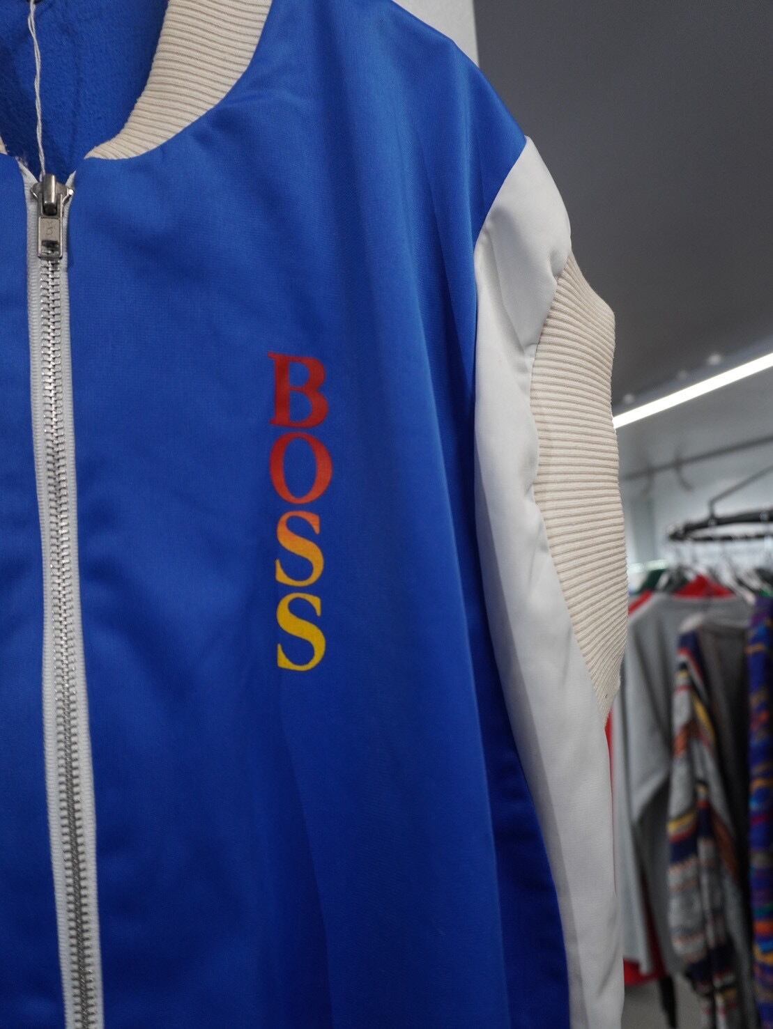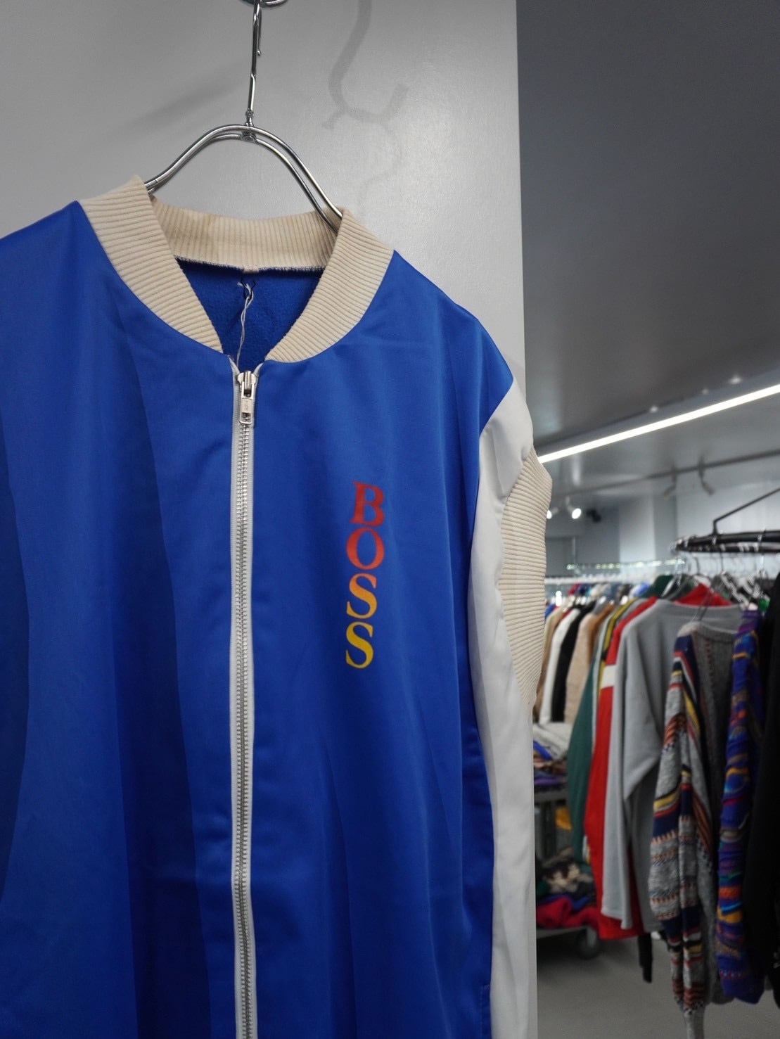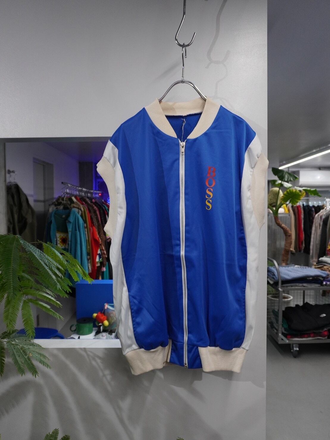 フロントに縦配置された「BOSS」ロゴ刺繍が印象的な、スリーブレス仕様のトラックジャケット。