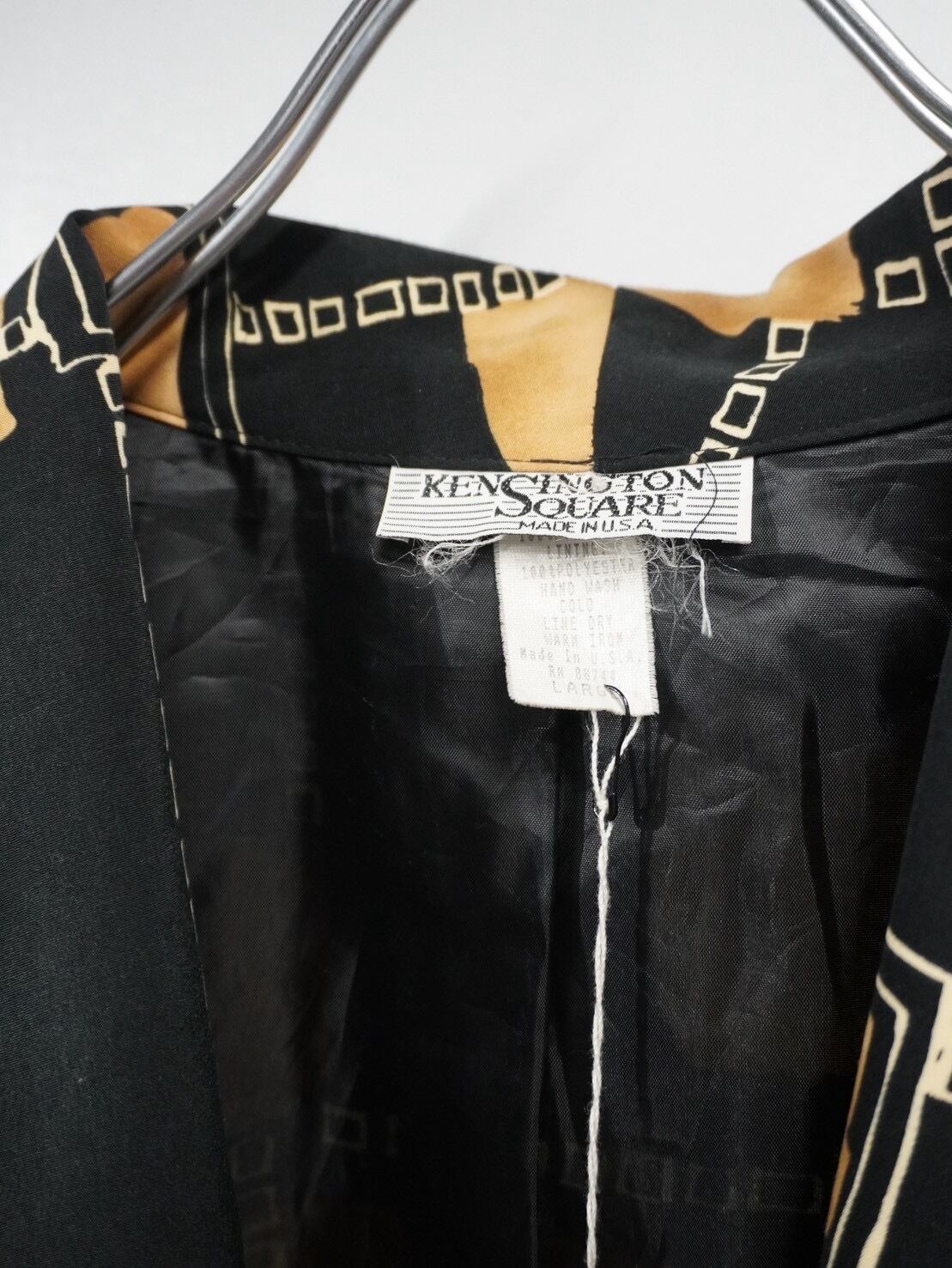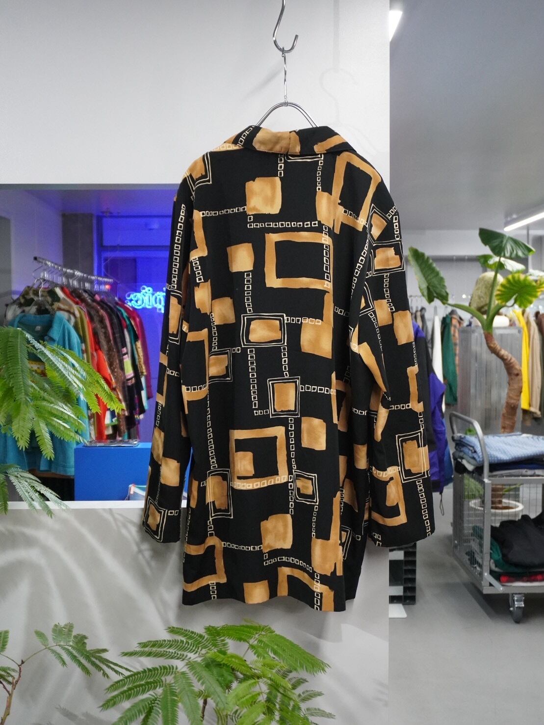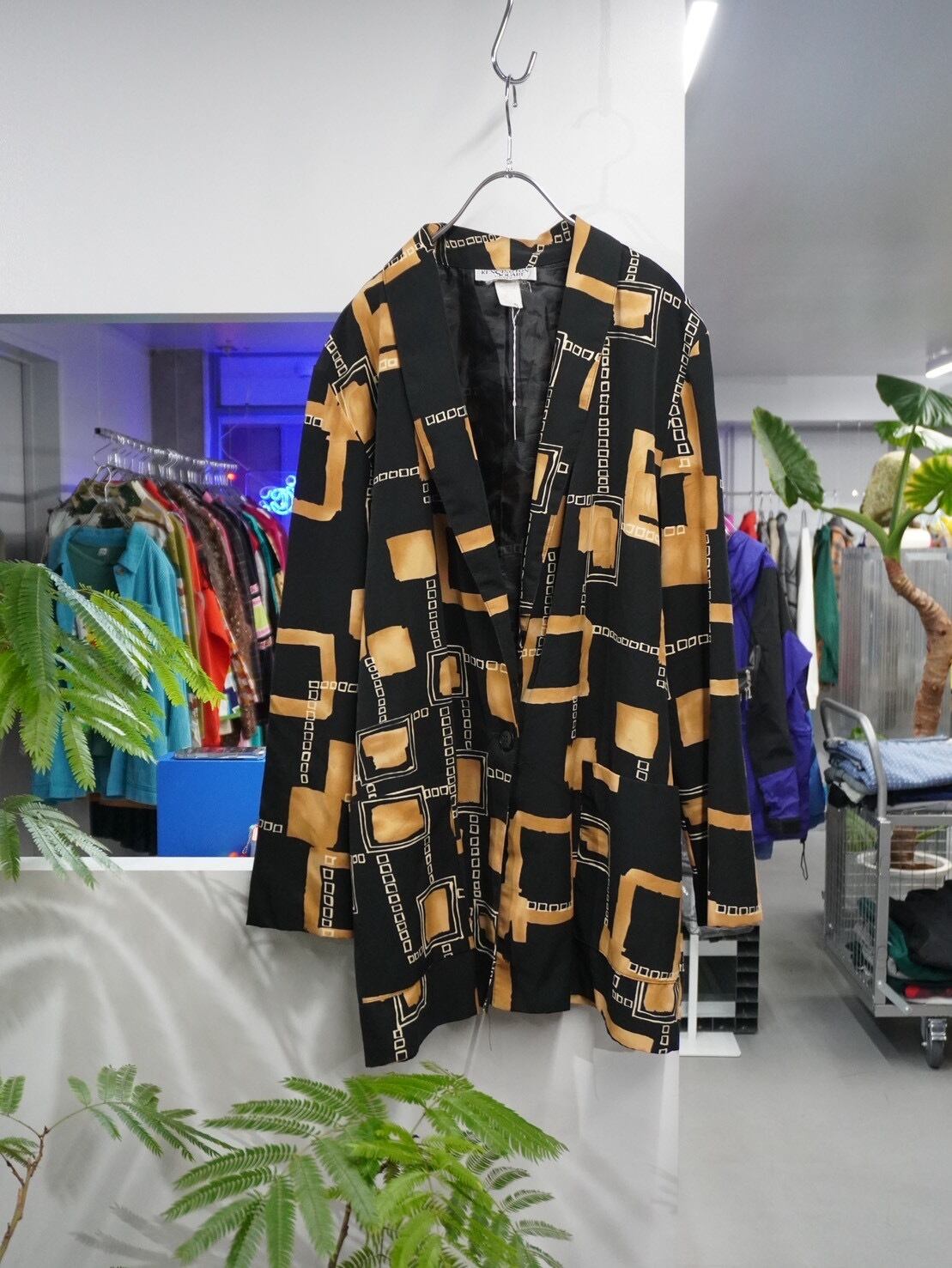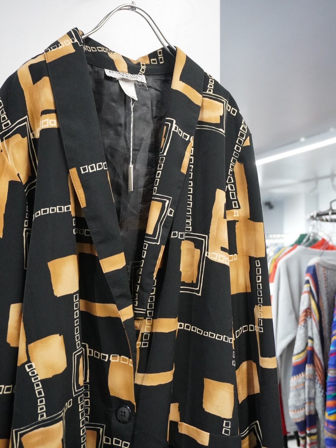 ブラックベースにマスタードカラーのジオメトリックパターンを大胆に配置した、90年代らしいアート性の高い一着。